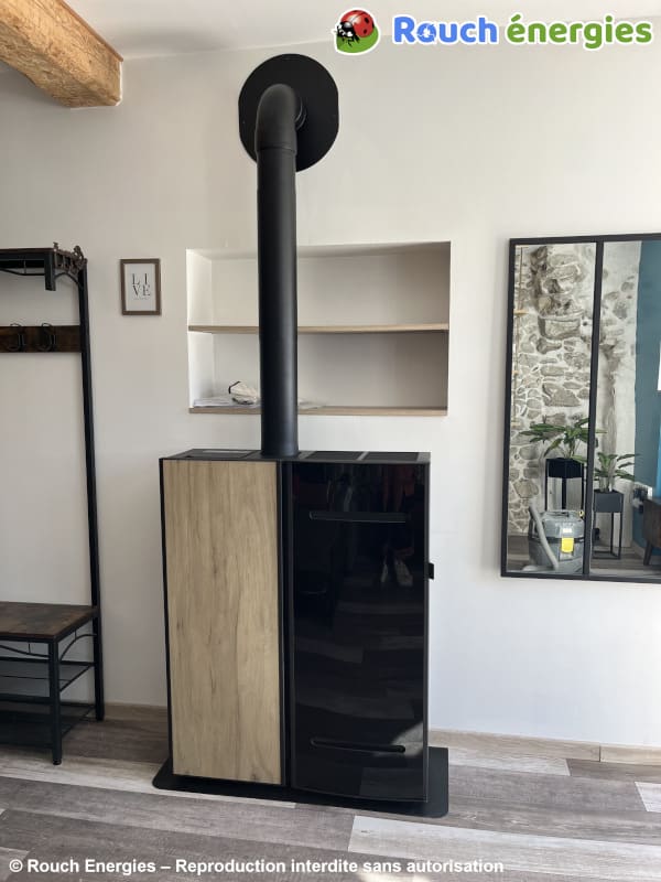 Véritable objet de décoration, le modèle retenu ici par notre cliente - un poêle à granulés de faible profondeur ACE de CMG doté d'un habillage Alya en grès imitant le chêne clair et en verre noir - est aussi un appareil de chauffage performant, pilotable à distance, dont la chaleur peut être partagée avec une pièce adjacente et dont la ventilation peut être désactivée au besoin.